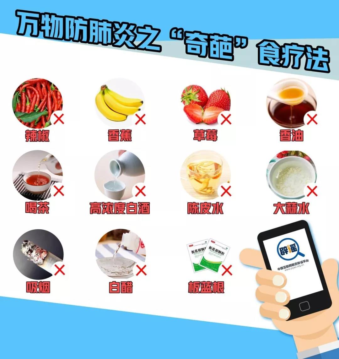 2020年的春節(jié) 一場新型冠狀病毒感染的肺炎 “來勢洶洶” 各類消息鋪天蓋地 一面是全民“戰(zhàn)疫”捷報頻傳 穩(wěn)定人心 一面是偽科學、疫情謠言反復翻炒 乘虛而入 慧眼識謠,理性防疫 請看 《鑒謠手冊:“新型冠狀病毒感染的肺炎”謠言的六大套路》 套路一:“萬物治肺炎:吃XXX可防止冠狀病毒肺炎” 流傳版本:吃辣椒、香蕉、草莓、大蒜、喝茶、酒、陳皮水、大蒜水等。流傳中多借用“鐘南山建議”或是某位營養(yǎng)專家、權(quán)威媒體等名號。